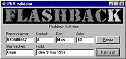 ![]() PNR validator - nyttoprogram (PC) Version 1.0. 12 Augusti, 1997. Flashback software 001 Flashback Softwares första produkt. Programmet gjordes av Brian Thorne efter en diskussion i nyhetsbrevet FNA om hur personnummer och kontrollsiffror räknas ut. Med detta program kan du enkelt verifierar kontrollsiffran i ett personnummer. Dessutom visas även en del andra uppgifter. Ladda ner PNR validator (100 kb) Flashback logo - typsnitt (PC/Mac) Februari 1998. Flashback software 002 Ett typsnitt som visar Flashbacks knowledge-logo när du trycker ned F på tangentbordet. Typsnittet för Macintosh är gjort av pseudonymen 'Freece', och typsnittet för PC är gjort av pseudonymen 'Aztro'. Ladda ner Mac version (10 kb) Ladda ner PC version (2 kb) |